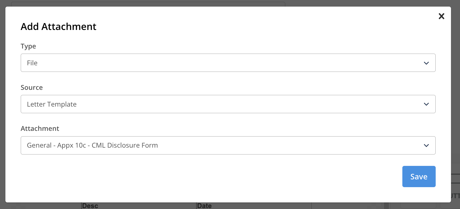For example, if the template users wish to attach is located in the letter section, users would select File as the Type, Letter Template as the Source and then choose the desired template from the dropdown.
