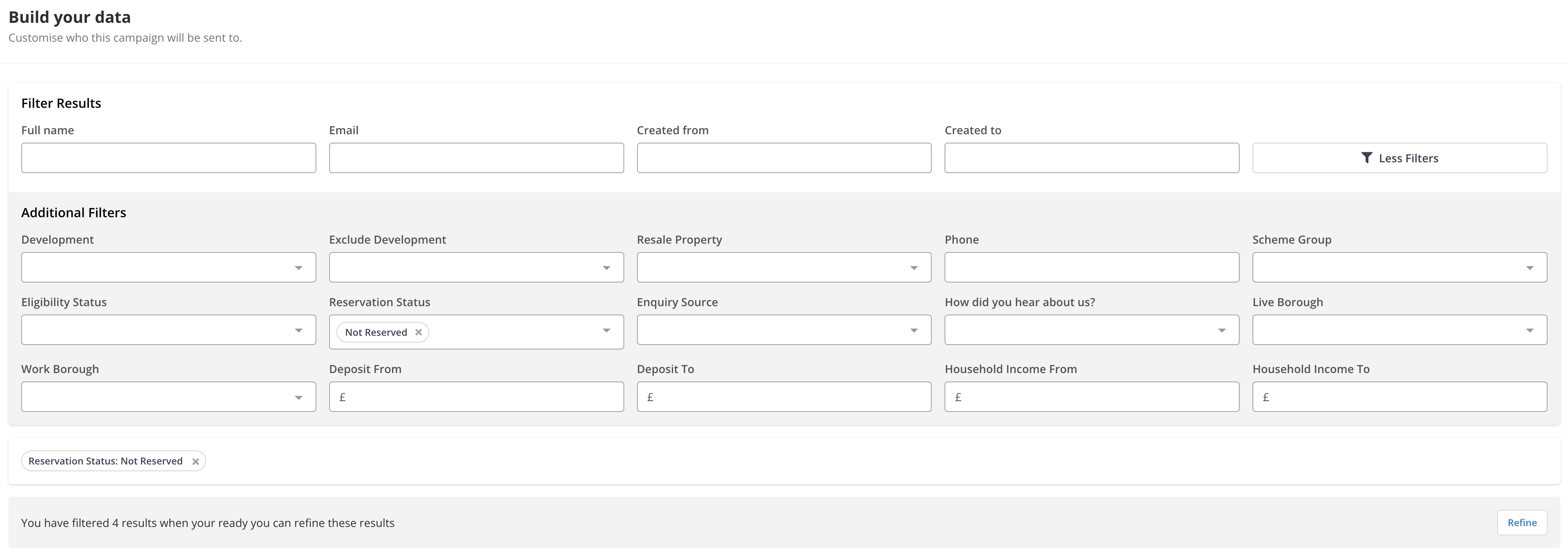 The build your data section is where users customize who they would like to send an email campaign to. There are several filters that can be utilized and the email campaign tool populates the recipients based on the selected filters.